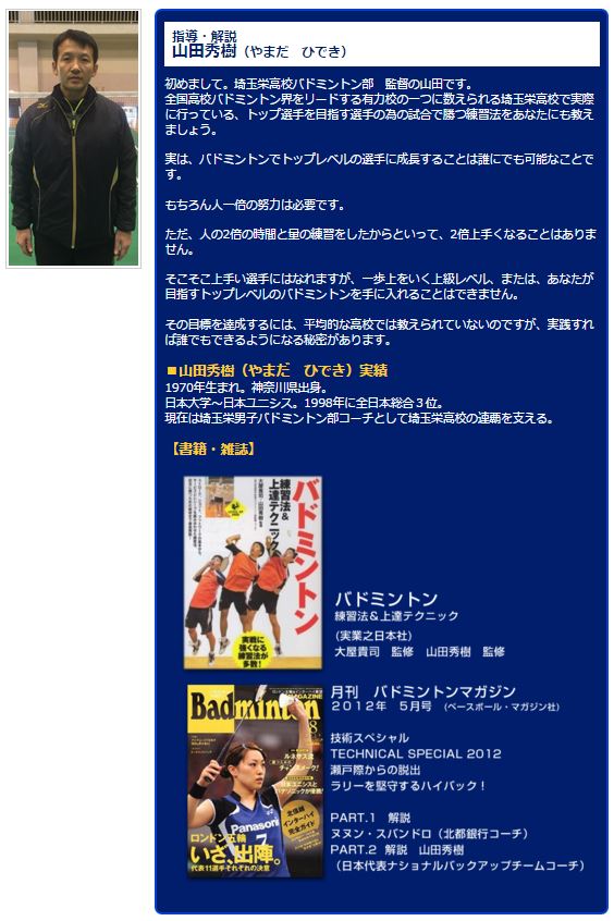 全国屈指の強豪校として知られる、埼玉栄高等学校で男子バドミントン部コーチを務める山田秀樹氏が、多くのトップ選手を育成、指導してきた経験から、一歩上を行く、トップレベルの選手を目指す方向けに、トータル的に効果が得られる内容にしています。