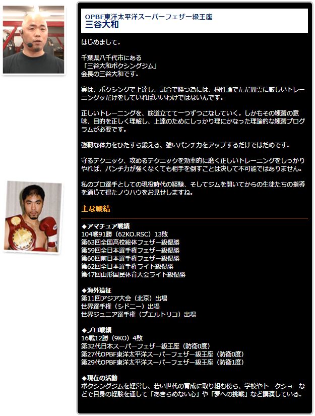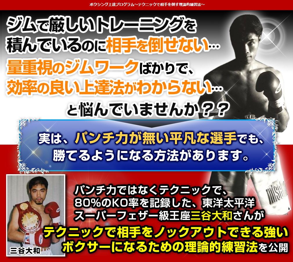 「ボクシング上達プログラム」は、元東洋太平洋スーパーフェザー級王座・三谷大和氏がテクニックで相手をノックアウトできる強いボクサーになるための理論的練習法を公開した動画教材です。