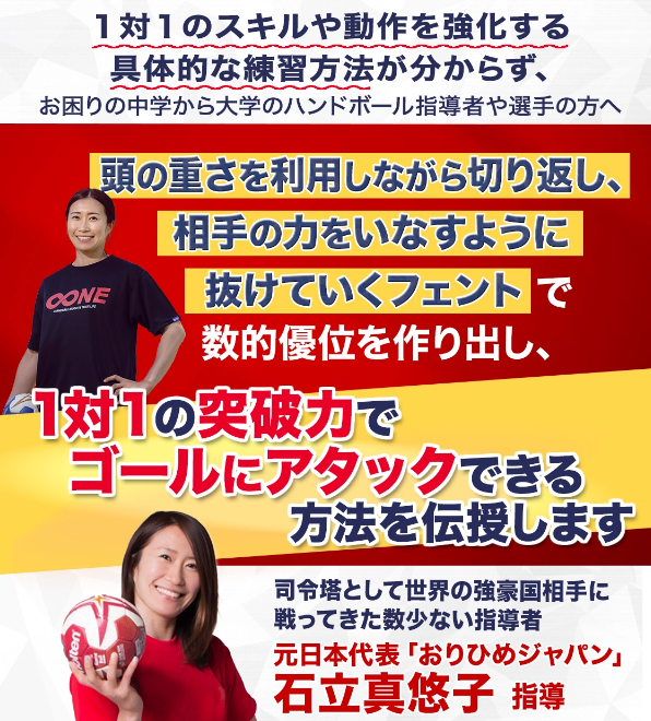 『石立真悠子 「1対1スキル」コーチング』は、ハンドボール未経験から強豪校の選手まで誰でも実践できるハンドボールのオフェンス上達の秘訣です。