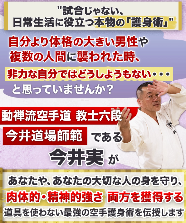 この今井先生監修の空手護身術の極意では、気が弱く力のない人間が真に自立し強い人間になるために取り組んでいる・・