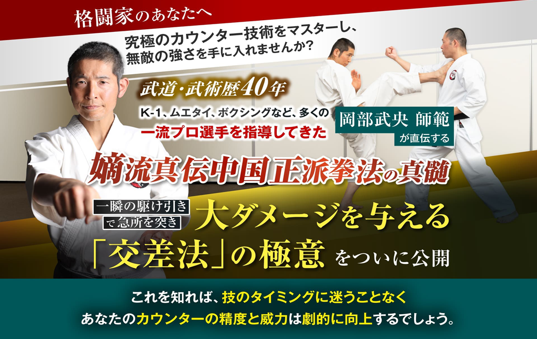 今回のオンライン動画(DVD)では、多くの一流のプロ格闘家を指導してきた岡部師範が、究極のカウンター技術のすべてを公開しています。
