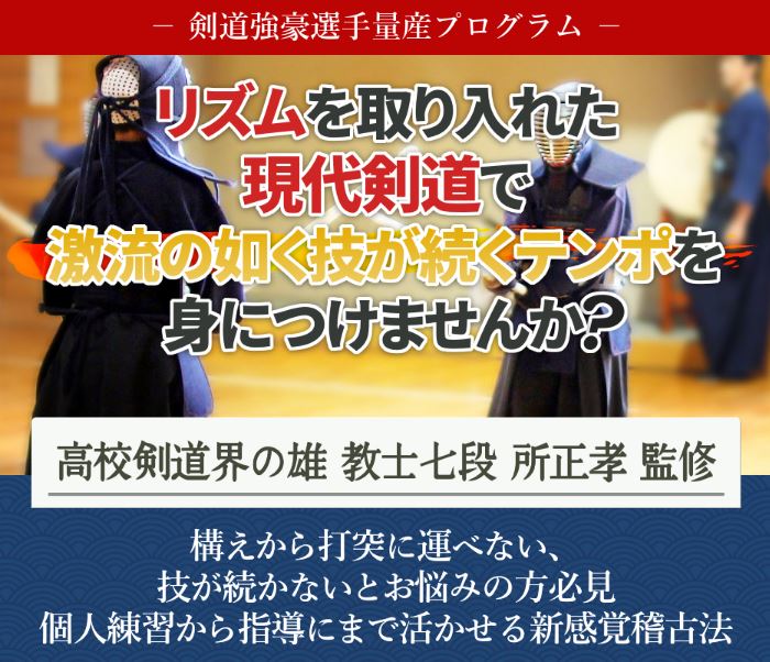 これを取り入れてこそ今までの伝統稽古も同時に光る仕組み。リズムとテンポを取り入れた現代伝統稽古法があなたの剣道を向上させ、勝利へ導きます。さああなたも、あなたの教え子さんも、強豪選手へ生まれ変わる日は目の前です。