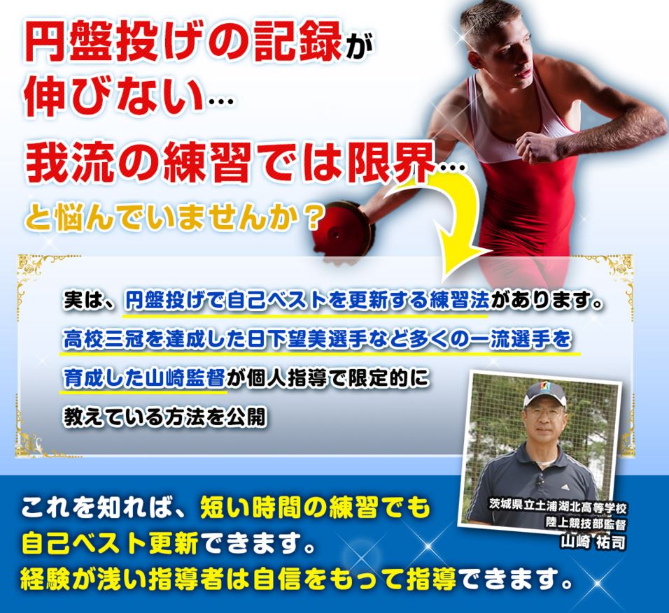 今回、ご紹介する上達プログラム(円盤投げ上達革命)は、初心者レベルの選手から実践できて、しかも、トレーニングを楽しみながら、短期間で記録を伸ばすための方法を余すことなく公開した上達プログラムです。