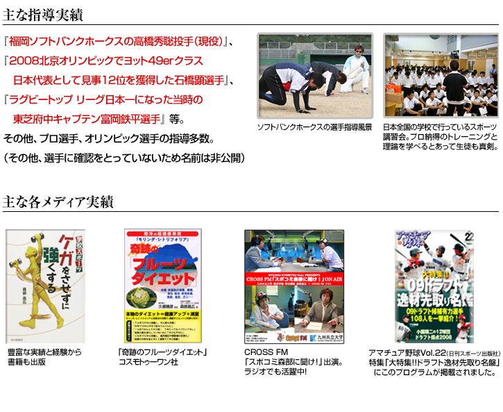多方面のスポーツ業界から支持されているプロフェッショナル・コンディショニングコーチ。独自のトレーニング理論を元に、数々のピッチャー、プロ選手へのトレーニング指導、トータルコンディショニングの提供をしている。