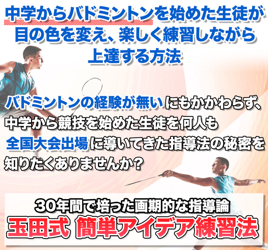「玉田式・中学生から始めるバドミントン・ラケットワーク習得法」は、中学からバドミントンを始めた生徒たちを全国大会に導いてきた秘密の指導法です。