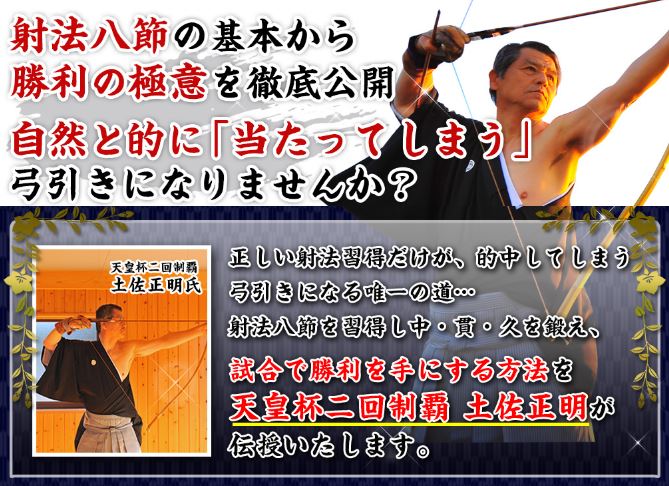 「弓道射法八節習得プログラム」は、天皇杯二回制覇の土佐正明が伝授する弓道上達プログラムです。